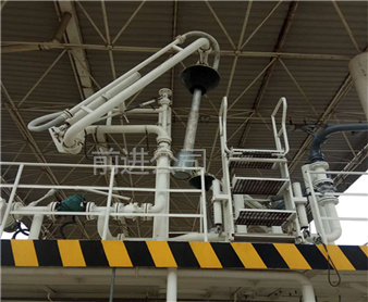 密闭式顶部装卸臂由5个旋转接组成回转**,液相4个,气相1个。气相一般为DN50,液相根据客户需要的流量选择。气相在转接处使用金属软管连接,保证鹤管的旋转灵活性。鹤管液相接口朝下,气相接口朝上,一般气相会多台汇总在一个主管上,如果单台排空的话,需要加带雨帽的阻火器,**管道进入点燃源。垂管上有一个锥形密封帽,装车时垂管插到槽车的顶部灌口,密封帽压实在灌口处,锁紧外臂锁紧杆(或者气缸压紧,在和油气回收配合使用时,建议鹤管增加气缸,达到充分密闭的作用,因为空的槽车在装车时物料逐渐增多,槽车轮胎压扁,槽车降低,密封帽就不能很好的密封了,必须有气缸对密封帽有一个压力,才能使密封帽始终跟紧灌口。达到有效密闭的效果,油气回收需要密闭效果达到90%-95%)密封帽密闭后,槽车里气化的介质就能通过鹤管上的气相管道排空或者抽入油气回收系统